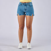 REF: 556262 Short corto tiro alto en denim licrado, color azul medio