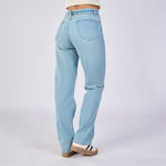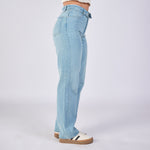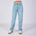 Tendencia y atemporalidad en una sola prenda. Diseñado y confeccionado en Colombia, este jean straight rígido de tiro medio en tono baby blue está elaborado en 100% algodón, ofreciendo estructura firme y una silueta definida. Su pretina doblada fija aporta carácter y detalle al diseño, convirtiéndolo en un básico moderno para looks frescos y actuales.