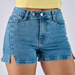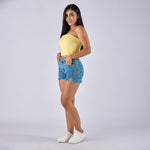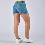Short corto para mujer de tiro alto y ajuste muy ceñido, ideal para climas cálidos, vacaciones, salidas casuales de día, conciertos y actividades al aire libre. Está confeccionado en una mezcla licrada de algodón, poliéster, rayón y spandex que ofrece alta elasticidad, comodidad y un estilo relajado sin perder estructura. Su tono azul medio es versátil y fácil de combinar.