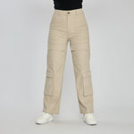 REF: 552577 Pantalón cargo bota recta tiro alto en denim stretch, color arena