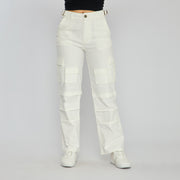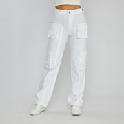 REF: 552559 Pantalón cargo bota recta tiro alto en denim stretch , color blanco