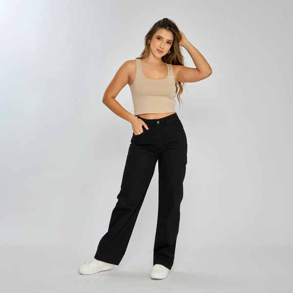 Jean wide leg tiro alto, rígido, color negro, con piedras negras brillantes en la parte delantera del jean, cintura ajustada, pierna holgada, con 5 bolsillos. Material. La modelo mide 1.68 y es talla 8.