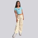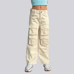 Diseño estructurado y versátil. Confeccionado en 100% algodón, ofrece una textura rígida y duradera que garantiza estilo y comodidad. Su corte wide leg y detalles cargo en color crudo lo hacen perfecto para un look moderno y minimalista.