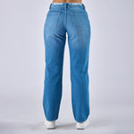 Este jean straight boot de tiro medio en color azul claro está confeccionado en 100% algodón, ofreciendo una estructura firme y un look relajado. Presenta sutiles desgastes en la pretina y junto al bolsillo, que le aportan un aire vintage y natural, manteniendo el equilibrio entre lo clásico y lo moderno.