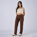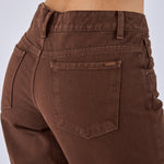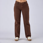 Este jean straight rígido de tiro medio en tono mocca está confeccionado en 100% algodón, ofreciendo estructura firme y silueta definida.