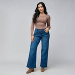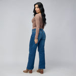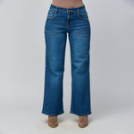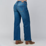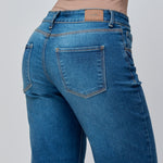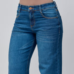 Este jean vaquero de tiro medio para mujer en color azul oscuro está confeccionado en una mezcla cómoda y flexible de 97% algodón y 3% elastano, ofreciendo un fit que se ajusta al cuerpo manteniendo una silueta definida. Su hilo en contraste agrega un toque moderno y sutil que lo convierte en un básico con personalidad.